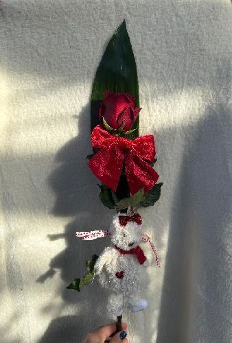 Rosa con fiocco, peluche bianco e foglia di aspidistra.