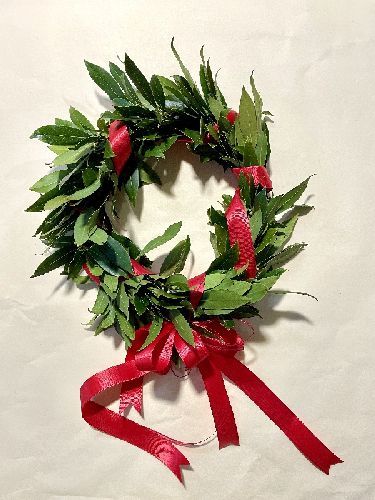 Corona per laurea triennale e magistrale per ogni facoltà, con foglie di alloro fresco e nastro in raso nel tradizionale colore rosso o colore a scelta.