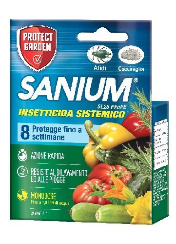 SANIUM SL 25 PFnPE è un insetticida sistemico concentrato che agisce per contatto ed ingestione contro i principali insetti dannosi delle piante come afidi, cicaline, dorifora e cocciniglie. Agisce già dopo un'ora e protegge fino a 8 settimane assicurando quindi sia un'azione abbattente che di lungo periodo.