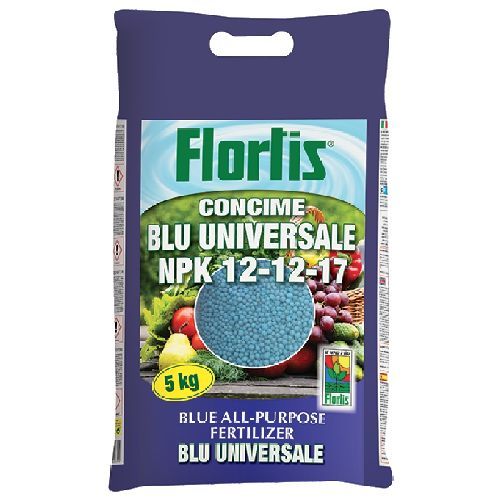 Concime granulare universale di colore blu avente un contenuto elevato di tutti gli elementi nutritivi fondamentali per la fertilità del terreno a garanzia di un corretto sviluppo di cespugli, siepi, aiuole, ortaggi, alberi e prati.