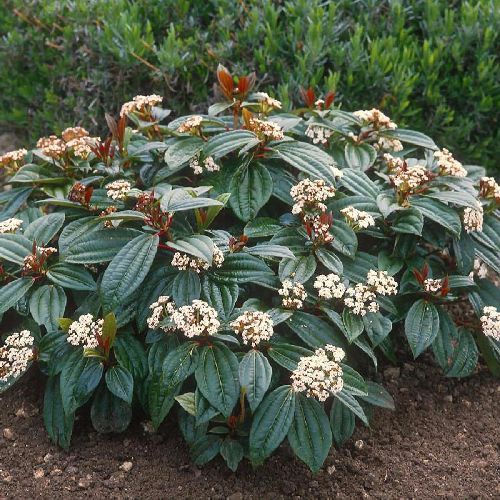 La pianta di Viburnum davidii è un arbusto ornamentale sempreverde di forma compatta, arrotondata, con grandi foglie ovali, dentate, di colore verde scuro, lunghe fino a 15 cm e profonde nervature