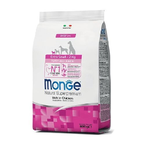Le crocchette Monge Natural Superpremium Extra Small Puppy & Junior con Pollo sono un alimento completo per cuccioli di taglia molto piccola.