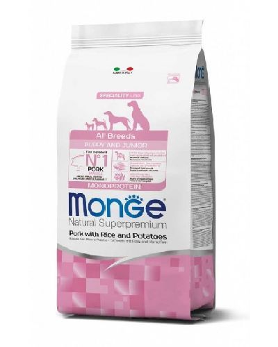 Monge Natural Superpremium All breeds Puppy and Junior Monoprotein* Maiale con Riso e Patate è un alimento completo per cani cuccioli di tutte le taglie.Specificamente sviluppato pensando al benessere del tuo cane, grazie alla presenza di sostanze nutritive di qualità frutto della ricerca Made in Italy. Prodotto formulato con un’unica fonte proteica animale*, il maiale, primo ingrediente, e con l’inclusione di carne fresca per una digeribilità e appetibilità ottimale. La ricetta è arricchita con prebiotici di ultima generazione xilo-oligosaccaridi (XOS) e riso integrale per il supporto del benessere intestinale e con ingredienti superfood come i semi di girasole, naturalmente ricchi di omega-6 e vitamina E.La formulazione contiene inoltre glucosamina e solfato di condroitina per il supporto dello sviluppo articolare e un bilanciato rapporto calcio/fosforo per un regolare accrescimento delle ossa e delle articolazioni del cucciolo.Senza coloranti e conservanti artificiali aggiunti.