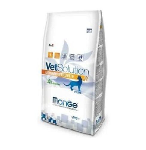 Monge VetSolution Urinary Struviteè un alimento dietetico completo formulato per la dissoluzione di calcoli a base di struvite e per la riduzione delle recidive dei calcoli di struvite nei gatti